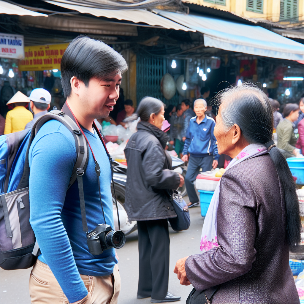 한국인 여행자 (민수): Xin chào. Tôi tên là 민수. Rất vui được gặp bạn. (씬 짜오. 또이 뗀 라 민수. 럿 부이 드억 갑 반.)